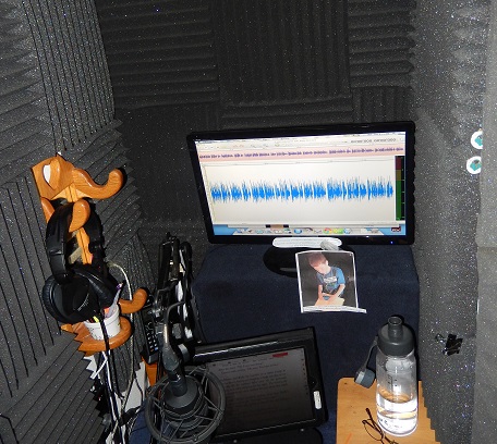 Fast forward a year or two, and my loving husband had built me a booth in the upstairs hallway. Being the meticulous engineer he is, he researched everything exhaustively and I was able to “come out of the closet” and move into my very own, beautiful, sound-deadened 3’ by 5’ recording booth, replete with Auralex foam and a pass-through for the cords to connect with my laptop outside the booth. I was in absolute heaven, and still am; just this week I wrapped up recording my 200th audiobook.